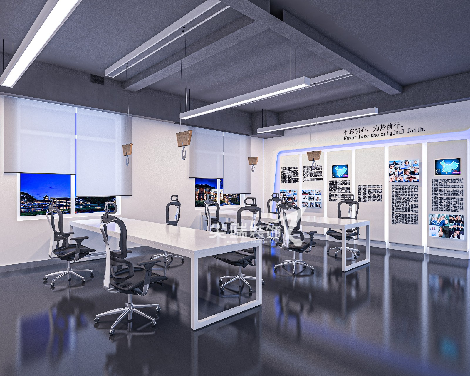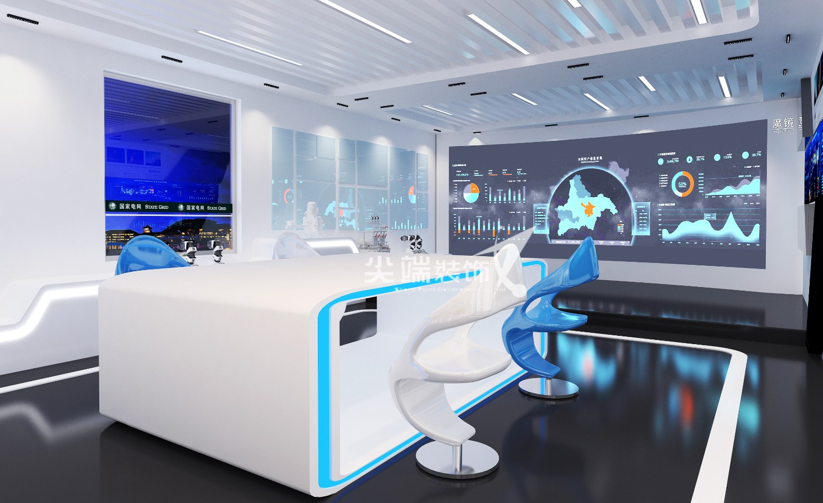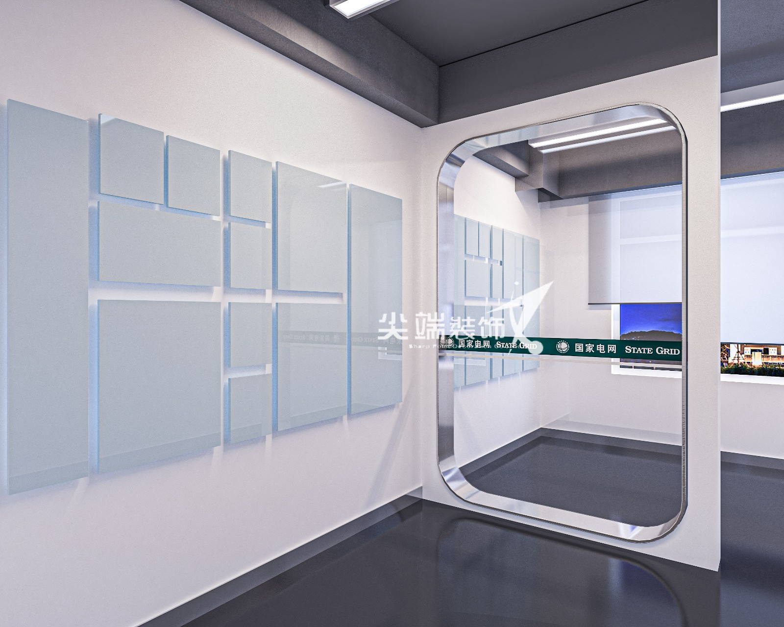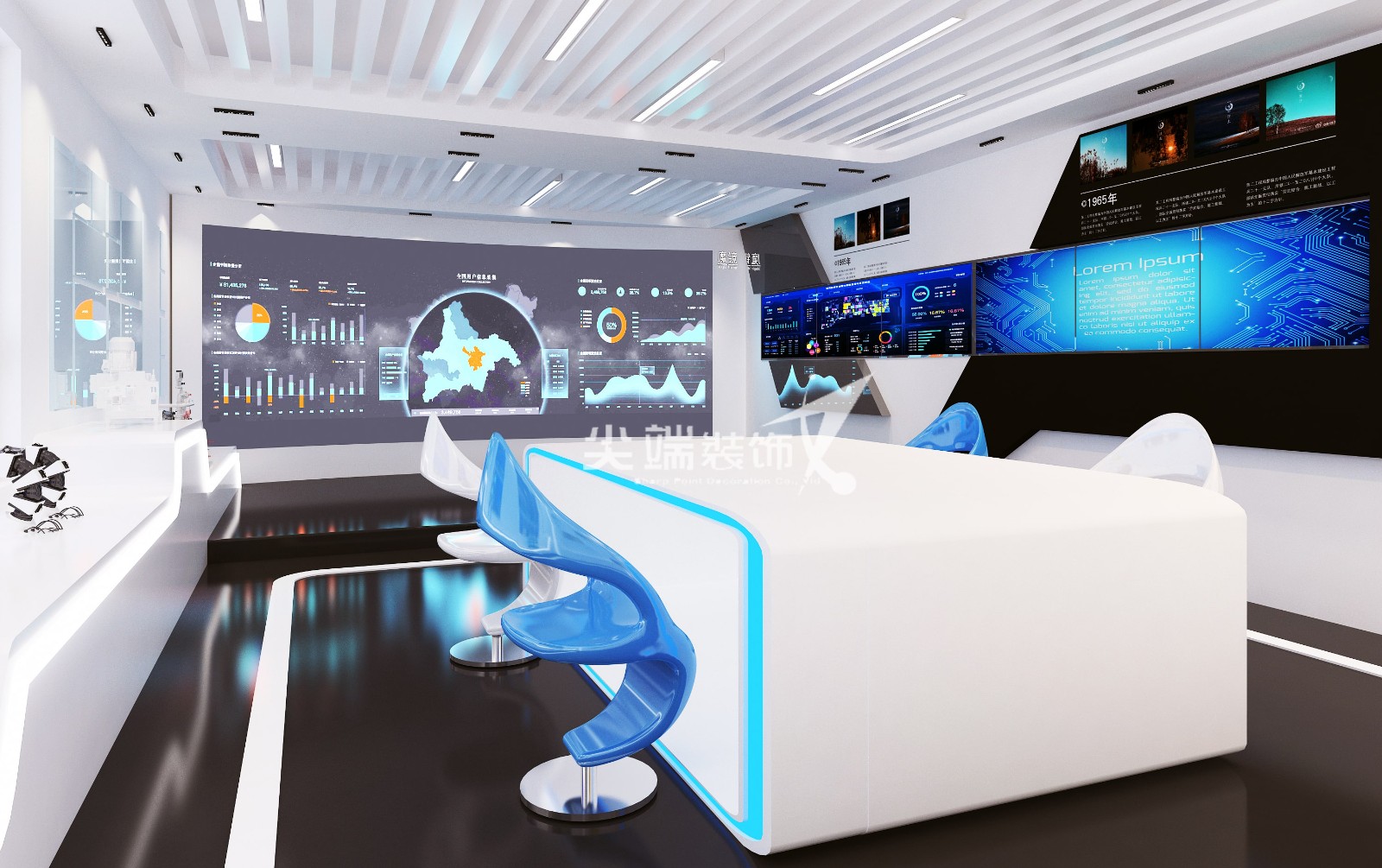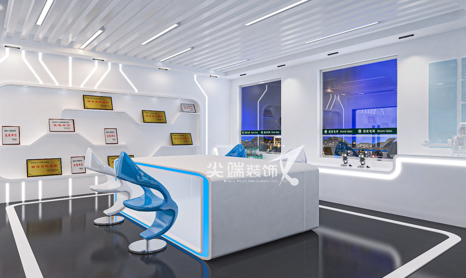 该展厅设计采用了极简的风格,黑白为主色调局部点缀科技蓝,色彩搭配形式,符合展厅倡导的展览学习的理念,同时科技神秘的环境氛围为空间增色不少。材质上采用烤漆饰面及烤漆玻璃及铁网为主,地面采用黑色石塑地板,便于清洁,也增加空间的氛围感。整体的造型在美学,人体工程与结构学的专业知识与技术的支持下得以完整的呈现。整个空间主要以条行平面灯具营造整体氛围,再辅以射灯做局部照明,展台辅以灯带,几种照明方式结合起来,使整个空间比较有视觉冲击力;内嵌的灯光设置让模型及所展示物更富有质感与立体感,强调设计与科技的融合。