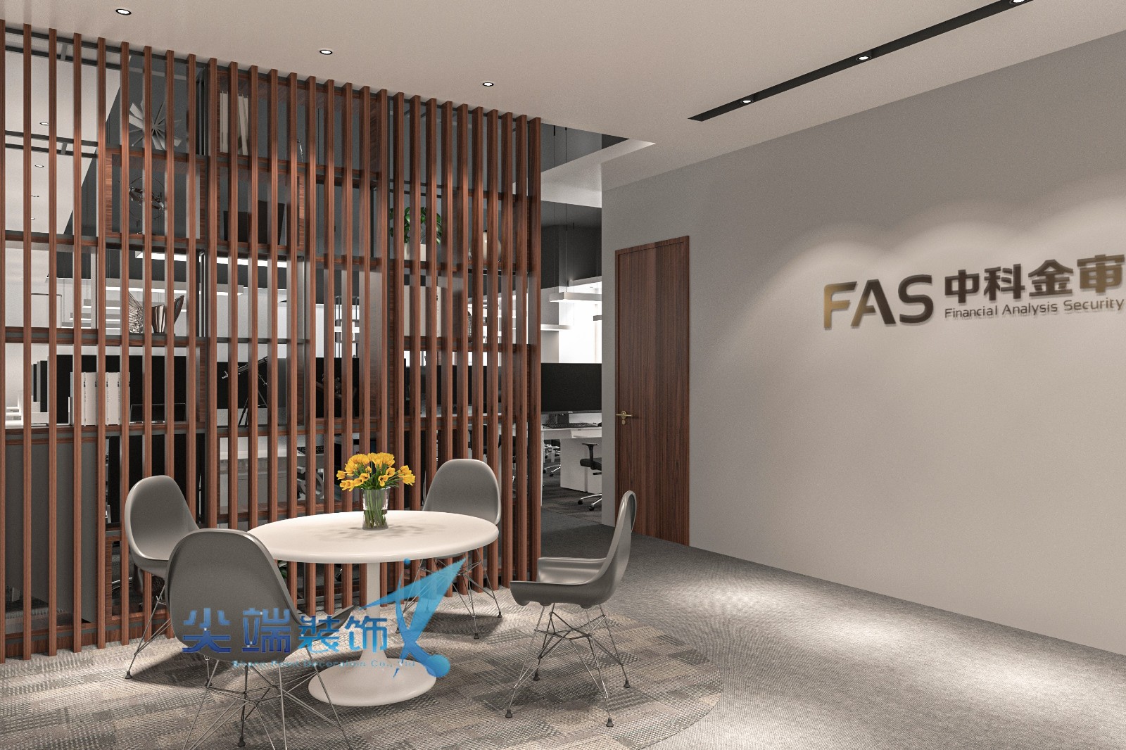该机构由中国科学院博士创建。空间分为开放式办公室区、VIP接待室、会议室、经理办公室等主要功能。设计上,基于行业特性作为首要定位。以黑、白、灰作为空间对比,使用胡桃木色作为点缀,活跃空间。形成了温和与冰冷的材质对比。