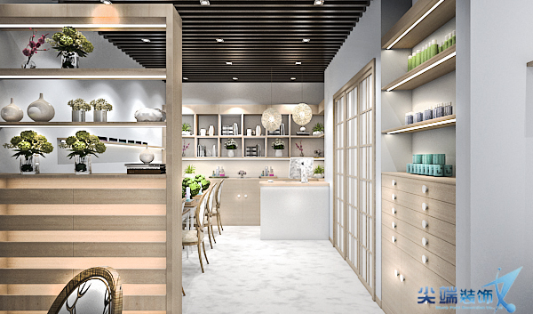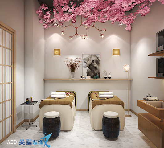 护理区之间采用了纱帘隔断,为不同客户提供了相对隐私的空间。美容护理为封闭空间增加私密性。空间采用白色及原木色来增加空间的粘性,粉色樱花、藤编的吊灯斑驳的投影仿佛置身日本。