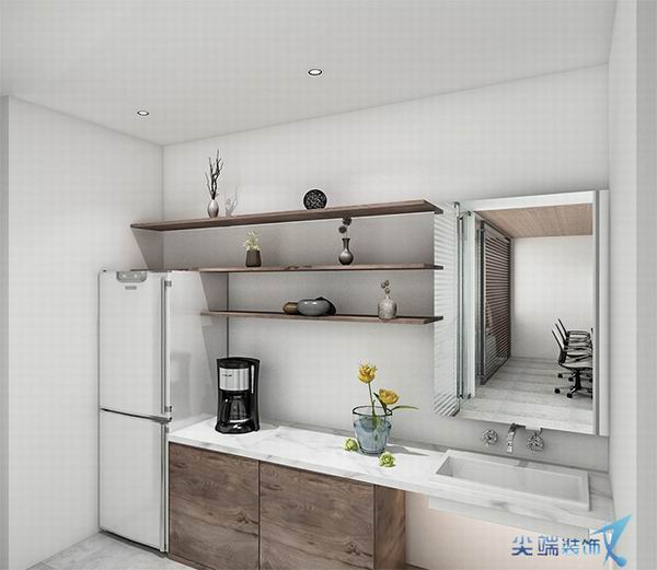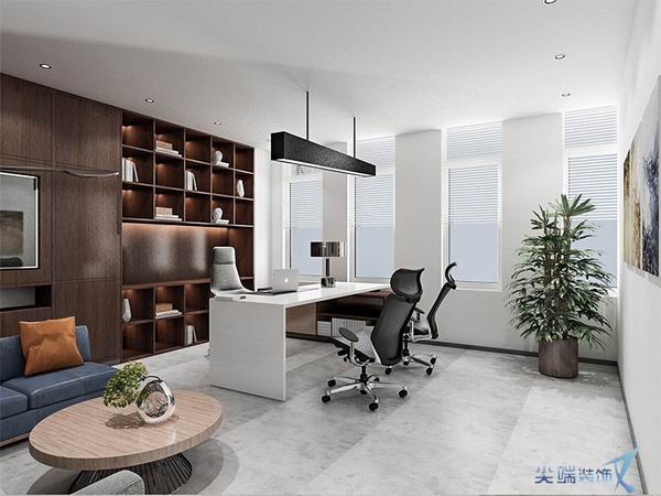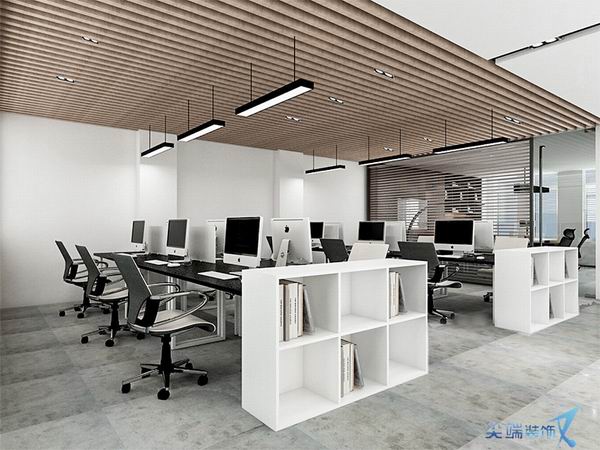 整个办公空间设计中的材质,大部分运用了钢化玻璃隔断,黑色烤漆玻璃,石膏板,混油造型墙,木转印铝方通等,玻璃隔断的通透性给空间带来一种宽敞明亮,高雅。地面使用的是灰色地砖,使空间视野开阔,柔和的地面放光给员工带来一种舒适的办公环境。