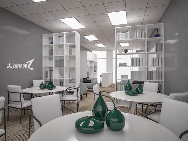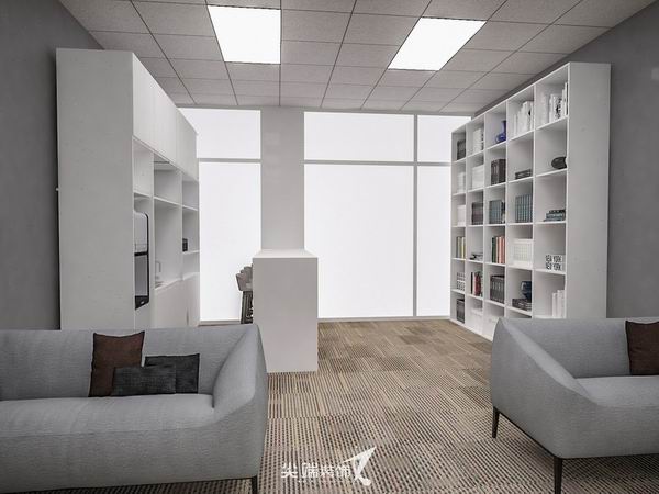 在装饰上通过无背板的柜体在不影响自然采光及视觉的前提下作空间功能合理分区,同时使用低反射的墙饰面配合静音地毯延展空间,增加空间舒适性,顶面为不影响弱电布线的维护使用了可移除的矿棉板吊顶,地面使用偏深色地毯,缓解室内噪音。